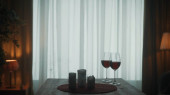 Facet szykuje się na randkę. Ciemna sylwetka mężczyzny zapala świece zapałkami. Świece i kieliszki z czerwonym winem na stole