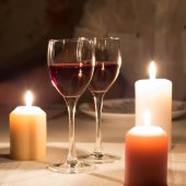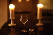 Koncepcja randkowania, wspólnej rekreacji. Romantyczny wieczór. Świece palą się na stole obok kieliszków czerwonego wina, na tle okna