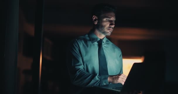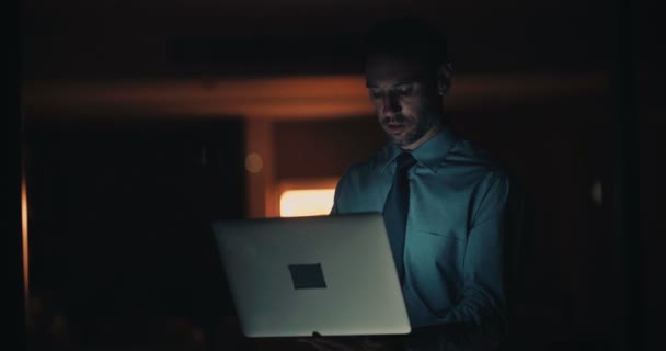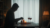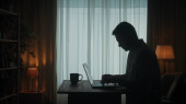 Ciemna sylwetka mężczyzny w słuchawkach bezprzewodowych przy stole przed laptopem. Człowiek pracuje na laptopie, słucha muzyki.