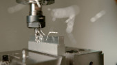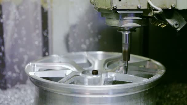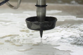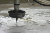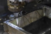 Scena zbliżeniowa wieloosiowej maszyny do cięcia strumieniem wody tnącej płytę aluminiową. Wysoka technologia obróbki blachy z maszyną CNC.