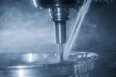 Zdjęcie "Scena zbliżeniowa wieloosiowej maszyny do cięcia strumieniem wody tnącej płytę aluminiową. Wysoka technologia obróbki blachy z maszyną CNC." może być wykorzystywane do celów osobistych i komercyjnych zgodnie z warunkami zakupionej licencji Royalty-free. Obraz jest dostępny do pobrania w jakości wysokiej rozdzielczości do 5760x3840.