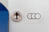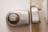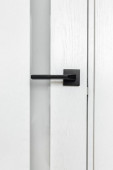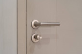 Prosta, nowoczesna metalowa klamka na zupełnie nowych drzwiach mieszkalnych, widok z przodu detal obiektu strony wewnętrznej, zbliżenie, nikt nie ma ludzi Nieruchomości blok mieszkania bezpieczeństwo ochrona abstrakcyjna koncepcja