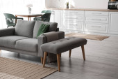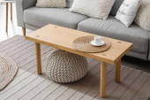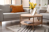 Drewniany stolik kawowy z rośliną i magazynem we wnętrzu jasnego salonu