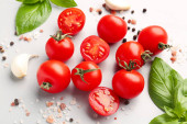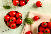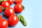 Drewniana deska ze świeżymi pomidorami wiśniowymi i bazylią na niebieskim tle