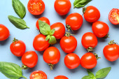 Zdjęcie "Drewniana deska ze świeżymi pomidorami wiśniowymi i bazylią na niebieskim tle" może być wykorzystywane do celów osobistych i komercyjnych zgodnie z warunkami zakupionej licencji Royalty-free. Obraz jest dostępny do pobrania w jakości wysokiej rozdzielczości do 5760x3840.