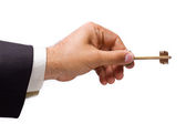 Motyw biznes: agent nieruchomości w kurtkę w ręku klucz do nowego mieszkania na biały na białym tle