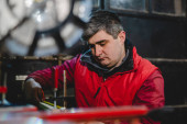 Zdjęcie "Mechanik rowerowy mocowania roweru i koła kontrolne mówił w warsztacie. Młodzi, kaukascy mechanicy pracujący sami. Serwis rowerowy, naprawa i modernizacja koncepcji" może być wykorzystywane do celów osobistych i komercyjnych zgodnie z warunkami zakupionej licencji Royalty-free. Obraz jest dostępny do pobrania w jakości wysokiej rozdzielczości do 5760x3840.