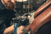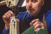 Mechanik rowerowy mocowania roweru i koła kontrolne mówił w warsztacie. Młodzi, kaukascy mechanicy pracujący sami. Serwis rowerowy, naprawa i modernizacja koncepcji