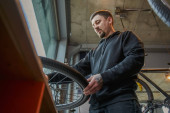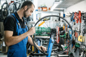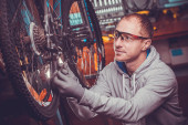 Widok na rower naprawiający w warsztacie rowerowym. Poważny człowiek zaangażowany w jego pracę. Zdjęcie z magazynu