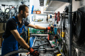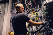 Zdjęcie "Wytatuowany człowiek mechanik rowerowy biorąc aparat koło rowerowe w warsztacie. Serwis rowerowy, naprawa i modernizacja. Wnętrze garażu z narzędziami i sprzętem" może być wykorzystywane do celów osobistych i komercyjnych zgodnie z warunkami zakupionej licencji Royalty-free. Obraz jest dostępny do pobrania w jakości wysokiej rozdzielczości do 5760x3840.