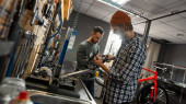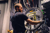 Wytatuowany człowiek mechanik rowerowy biorąc aparat koło rowerowe w warsztacie. Serwis rowerowy, naprawa i modernizacja. Wnętrze garażu z narzędziami i sprzętem