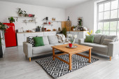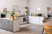 Zdjęcie "Wnętrze jasnej kuchni z blatami, półkami, stołem i sofami" może być wykorzystywane do celów osobistych i komercyjnych zgodnie z warunkami zakupionej licencji Royalty-free. Obraz jest dostępny do pobrania w jakości wysokiej rozdzielczości do 5760x3840.