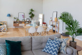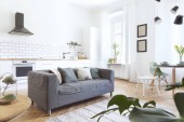 Wnętrze jasnej kuchni z blatami, półkami, stołem i sofami