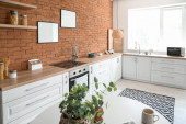 Wnętrze kuchni z czerwoną lodówką, lady, półki i krzesła