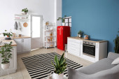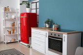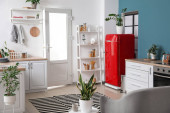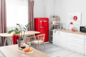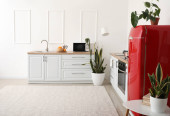 Wnętrze jasnej kuchni z czerwoną lodówką, licznikami i roślinami