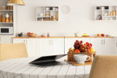 Kuchenka mikrofalowa, ekspres do kawy, mikser i komplet talerzy na drewnianym stole w nowoczesnej kuchni