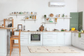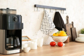 Zdjęcie "Kuchenka mikrofalowa, ekspres do kawy, mikser i komplet talerzy na drewnianym stole w nowoczesnej kuchni" może być wykorzystywane do celów osobistych i komercyjnych zgodnie z warunkami zakupionej licencji Royalty-free. Obraz jest dostępny do pobrania w jakości wysokiej rozdzielczości do 5760x3840.