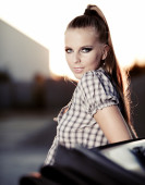 Sexy kobieta z pięknej twarzy świeży, pozowanie na zewnątrz