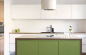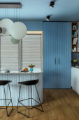 Zdjęcie "Creative composition of kitchen interior with marble kitchen island, blue kitchen furnitures, gray fridge, modern lamp, bowl with fruits, big window and personal accessories. Home decor. Template. " może być wykorzystywane do celów osobistych i komercyjnych zgodnie z warunkami zakupionej licencji Royalty-free. Obraz jest dostępny do pobrania w jakości wysokiej rozdzielczości do 5760x3840.