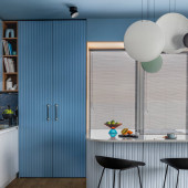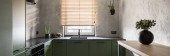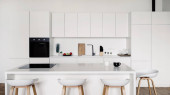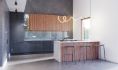 mieszkanie typu studio ze stylowym wnętrzem. kuchnia wyspa z ciemnym blatem, drewniane stołki bar, meble szafy i nowoczesne urządzenia gospodarstwa domowego