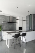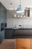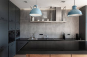 Zdjęcie "mieszkanie typu studio ze stylowym wnętrzem. kuchnia wyspa z ciemnym blatem, drewniane stołki bar, meble szafy i nowoczesne urządzenia gospodarstwa domowego" może być wykorzystywane do celów osobistych i komercyjnych zgodnie z warunkami zakupionej licencji Royalty-free. Obraz jest dostępny do pobrania w jakości wysokiej rozdzielczości do 5760x3840.