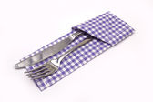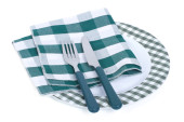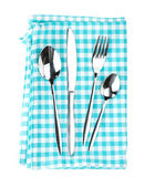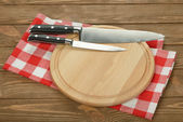 Drewniana płyta kuchenna, sztućce i czysta serwetka na białym tle