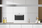 Zdjęcie "Luksusowe beżowe wnętrze kuchni domowej z blatem na betonowej podłodze. Stylowa część kuchenna z przyborami kuchennymi, nowoczesny wystrój szafy do mieszkania typu studio. Renderowanie 3D" może być wykorzystywane do celów osobistych i komercyjnych zgodnie z warunkami zakupionej licencji Royalty-free. Obraz jest dostępny do pobrania w jakości wysokiej rozdzielczości do 5760x3840.