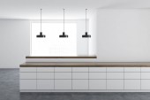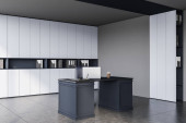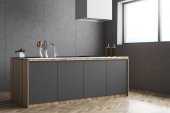 Luksusowe beżowe wnętrze kuchni domowej z blatem na betonowej podłodze. Stylowa część kuchenna z przyborami kuchennymi, nowoczesny wystrój szafy do mieszkania typu studio. Renderowanie 3D