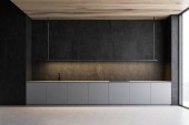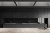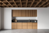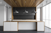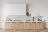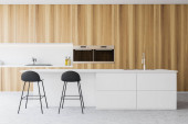 Białe wnętrze kuchni domowej z betonową wyspą bar, drewniane ukryte półki i umywalka z kuchenką i przyborami kuchennymi. Przytulne miejsce do gotowania z szafką i blatem. Renderowanie 3D