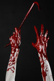 Krwawe Halloween tematu: krwawa ręka trzyma ax bloody Butchers na białym tle na czarnym tle w studio