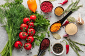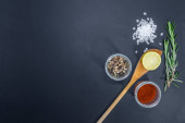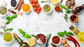 Świeże steki wołowe gotowe do grillowania, ujęcie z góry. Przyprawy, warzywa, owoce i zioła.