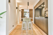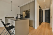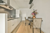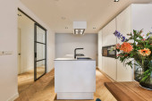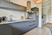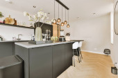 Zdjęcie "nowoczesna kuchnia z czarnymi szafkami i białe blaty w centrum pokoju jest duże lustro na ścianie" może być wykorzystywane do celów osobistych i komercyjnych zgodnie z warunkami zakupionej licencji Royalty-free. Obraz jest dostępny do pobrania w jakości wysokiej rozdzielczości do 5760x3840.