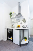 nowoczesna kuchnia z czarnymi szafkami i białe blaty w centrum pokoju jest duże lustro na ścianie