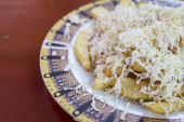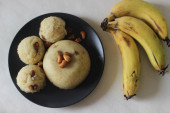 Ethakka idiyappam, zdrowe gotowane na parze jedzenie. Strunowe leje lub idiyappam wykonane z mąki ryżowej ciasto zmieszane z parą plantanu. Kręcony tradycyjną prasą idiyappam i dojrzałymi plantanami