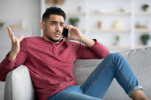 Zdjęcie "Wściekły młody Afroamerykanin rozmawiający przez telefon w domu. Podnosi ręce, rozwiązuje problemy." może być wykorzystywane do celów osobistych i komercyjnych zgodnie z warunkami zakupionej licencji Royalty-free. Obraz jest dostępny do pobrania w jakości wysokiej rozdzielczości do 5760x3840.
