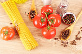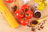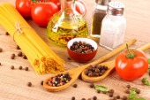 makaron spaghetti z pomidorami, oliwą, peper i bazylia na