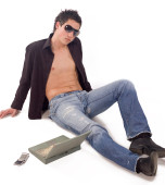 portret przystojny, młody człowiek w okularach pozowanie na tył biały