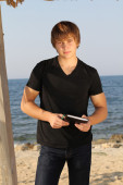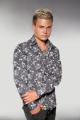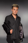portret przystojny mężczyzna patrząc od na białym tle na czarny backgrou