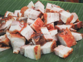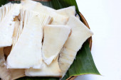 Kawałki Vattayappam. Gąbczaste ciasto ryżowe na parze z suszonymi żurawinami. Tradycyjna przekąska z czasów herbaty z Kerali, przygotowana z sfermentowanego ciasta ryżowego i kokosowego. Strzał na liściu banana