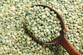 Kupie zielony groszek, z drewnianą łyżką i płyty drewniane