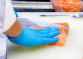 Zdjęcie "Zbliżenie sushi maker w czarnych rękawiczkach owijania rolki Kalifornii z bambusowej maty sushi w profesjonalnej kuchni" może być wykorzystywane do celów osobistych i komercyjnych zgodnie z warunkami zakupionej licencji Royalty-free. Obraz jest dostępny do pobrania w jakości wysokiej rozdzielczości do 5760x3840.