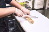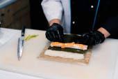 Zbliżenie sushi maker w czarnych rękawiczkach owijania rolki Kalifornii z bambusowej maty sushi w profesjonalnej kuchni