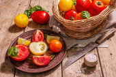 Kolorowe zbiory pomidorów. Dojrzałe warzywa żebrowane ze świeżymi liśćmi bazylii. Soczysty składnik sałatki letniej, drewniane deski tła, widok z góry