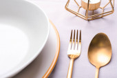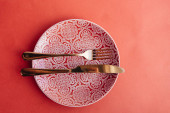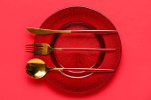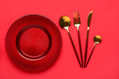Nakrycie stołu z czystą płytą i sztućcami na czerwonym tle