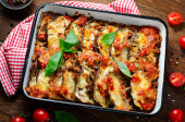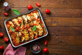 Zdjęcie "Bakłażan zapiekanka, palone Bakłażan danie z mielonego mięsa, Sos pomidorowy i Mozzarella na drewnianym tle" może być wykorzystywane do celów osobistych i komercyjnych zgodnie z warunkami zakupionej licencji Royalty-free. Obraz jest dostępny do pobrania w jakości wysokiej rozdzielczości do 5760x3840.
