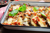 Zdjęcie "Bakłażan zapiekanka, palone Bakłażan danie z mielonego mięsa, Sos pomidorowy i Mozzarella na drewnianym tle" może być wykorzystywane do celów osobistych i komercyjnych zgodnie z warunkami zakupionej licencji Royalty-free. Obraz jest dostępny do pobrania w jakości wysokiej rozdzielczości do 5760x3840.