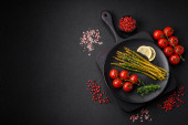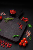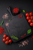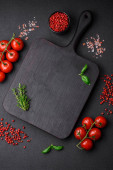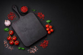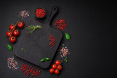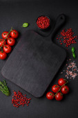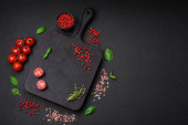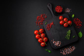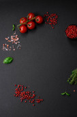 Składniki do gotowania pomidorów wiśniowych, soli, przypraw i ziół na ciemnym tle betonu