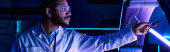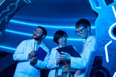 Zdjęcie "sztandar, Futurystyczna wymiana: Trzech naukowców i stażysta obserwują kolegów" może być wykorzystywane do celów osobistych i komercyjnych zgodnie z warunkami zakupionej licencji Royalty-free. Obraz jest dostępny do pobrania w jakości wysokiej rozdzielczości do 5760x3840.