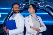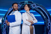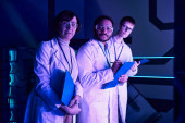 Futurystyczna obserwacja: Trzech naukowców bada nowo utworzone urządzenie w Neon-Lit Science Center