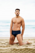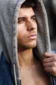 Przystojny mężczyzna młody niebieski oczy pozowanie w wielkomiejskim